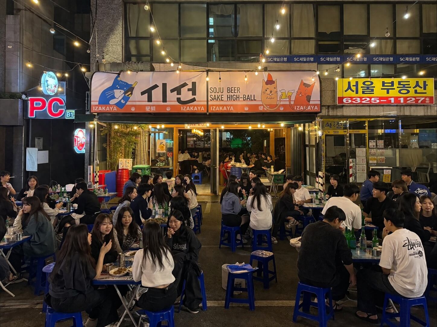 This area attracts young men and women as well as office workers, creating a lively and energetic atmosphere. On busy nights, outdoor seating fills up quickly, and it’s common to see people casually chatting between tables.